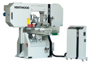 - Kentwood HBR-300 horizontal band resaw features push guides, hydraulic band tensioning, cast iron wheels, and an advanced touchscreen power control device.