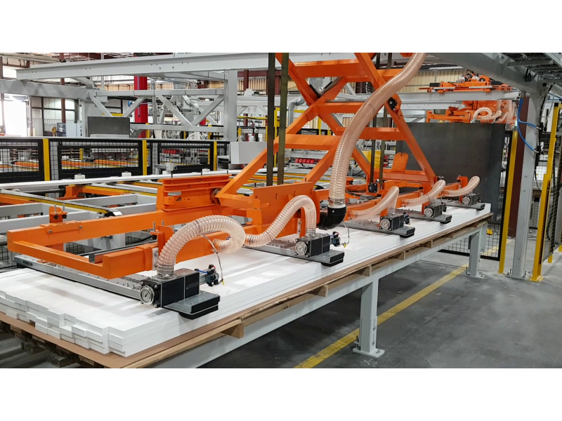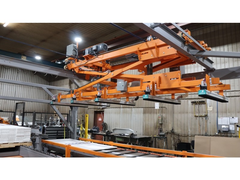 The MANYX stacker/destacker is an equipment that allows to feed lumber without operators in many types of woodworking equipment like moulders, planers, CNC routers or optimizing lines for example. The MANYX can feed and separate layers of incoming lumber bundles, with or without sticks, random widths and lengths or even some profiled boards depending on the final configuration. It can also be designed to stack material coming out from a finishing line or in palletizing operations in nested flooring applications.
