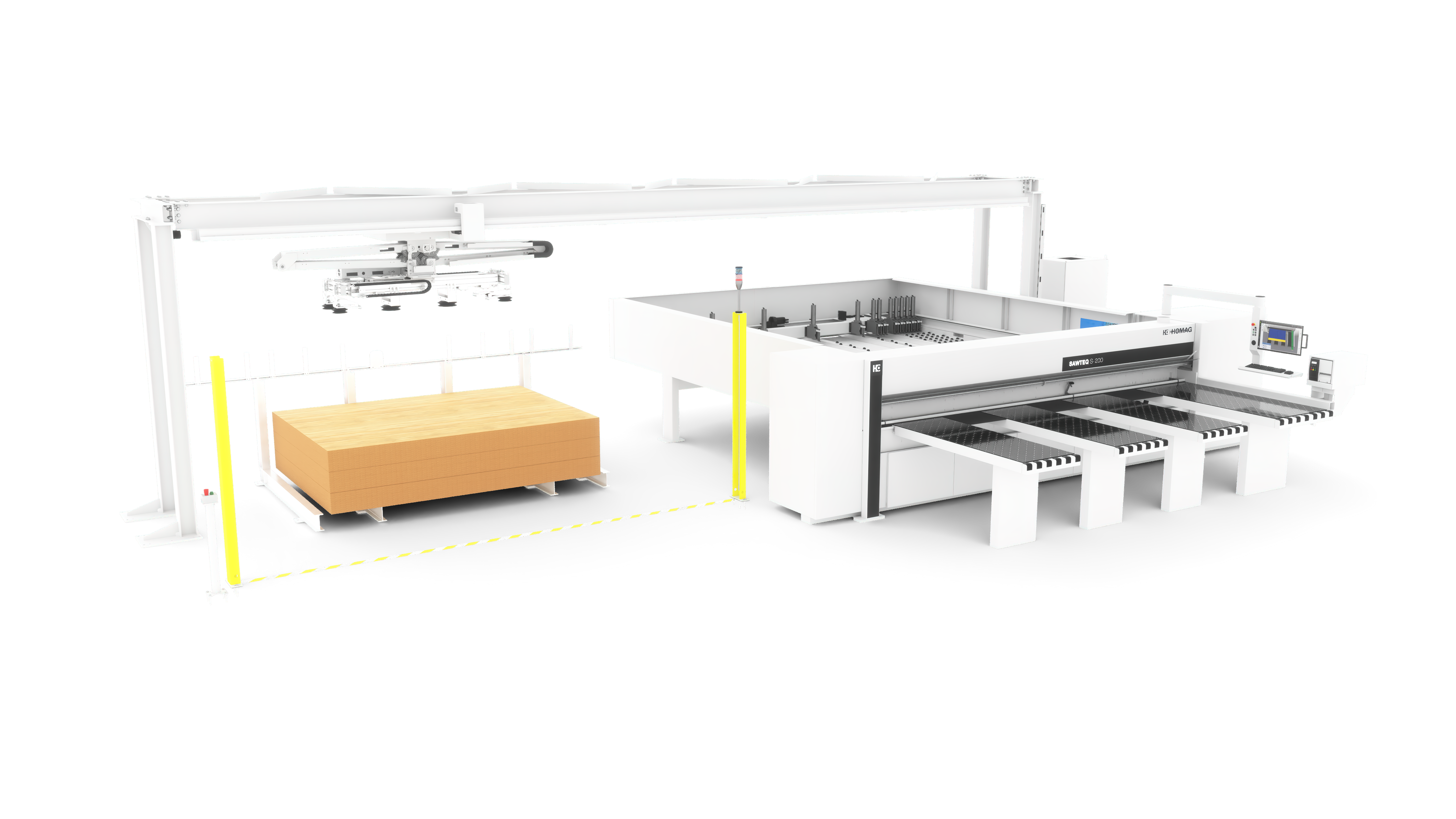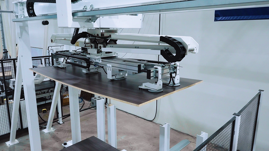 Modeled after the larger HOMAG STORETEQ P-300, the F-100 has many of the same automated panel storage and retrieval capabilities and is simplified with single-axis movement. The gantry uses vacuum suction to fetch the needed board just in time from the stacking area, rotating the material as needed, and placing it on the proper machine. As a result, the continuous process flow increases the productivity of your equipment.