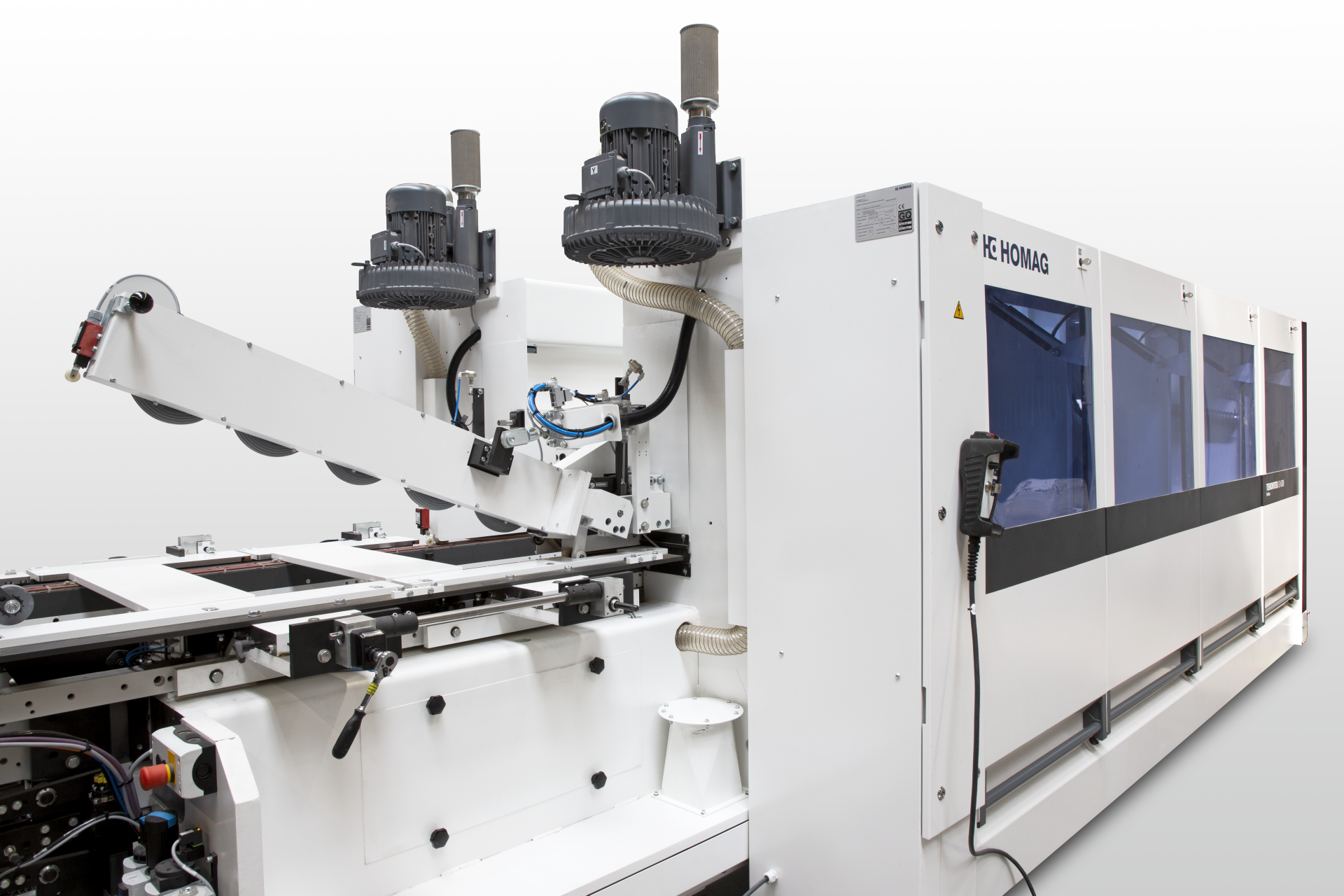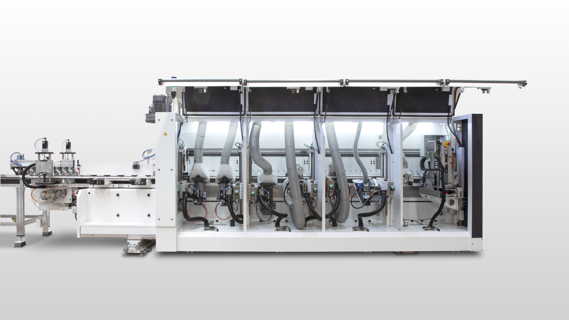 High-performance double-end profiler can be configured as required to tackle a host of different tasks: angle cuts, bevel cuts, profiling, rabbeting, grooving, sanding and corner processing. Thanks to its robust design, low-wear technology and high level of availability, this machine is exactly the right choice for manufacturing doors, fronts and panels.