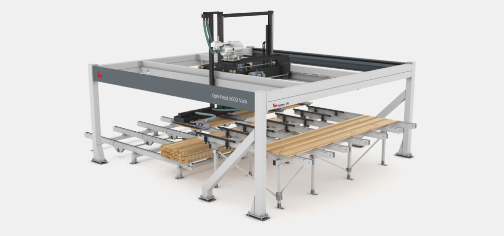 Opti-Feed 6000 Vack is a vacuum de-stacking unit which is able to feed complete or partial layers of workpieces in the correct order into different main machines. Opti-Feed 6000 Vack is suitable for feeding long workpieces from 1,200 – 6,000 mm (4’- 20’) at a capacity of 4 layers per minute, by random or uniform lengths and widths.