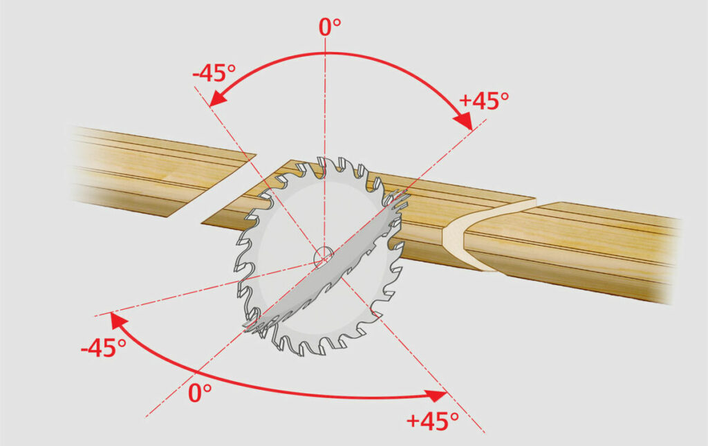 The saw unit is tiltable, pneumatically or servo-controlled (optional), and can cut at any angle between +45 and -45 degrees in two planes.