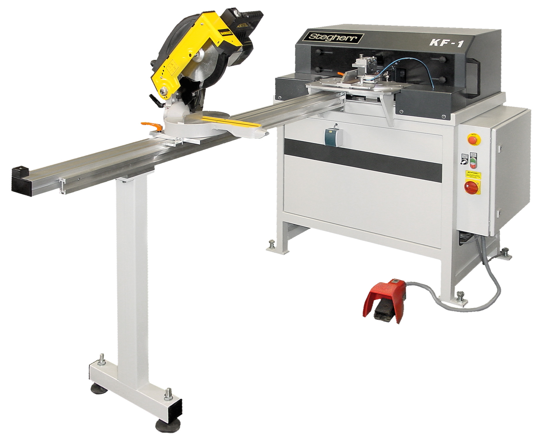 The KF-1 is the all-round machine for coping, cutting to length, drilling and dowel driving with pneumatic clamping and fully automatic working cycles on the stationary workpiece. The main characteristic of this machine are the two high-speed milling spindles, rotating in opposite directions. The result is a perfect, tear-free coping. Comfortable Operation: The working process is fully automatic on the fixed workpiece, held in place by pneumatic workpiece clamping. If equipped with the cross cut saw mounted on a graduated fence, the bars can also be easily cut to length.