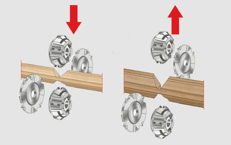 The V-cuts for the cross joints are performed by the top and bottom cutter heads, the 90° cuts by the back and front cutter heads. All cuts are done in one clamping. This creates the perfect joint and quality results.