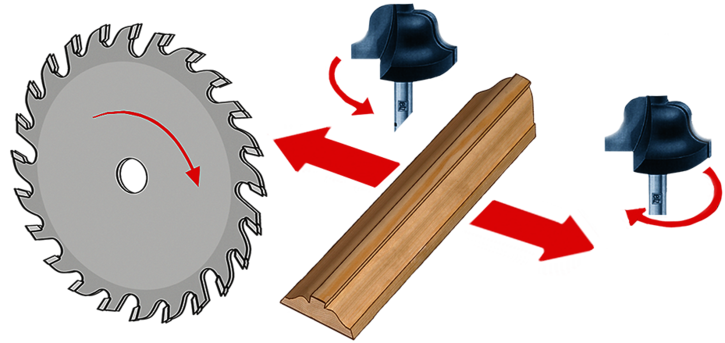 High-speed milling spindles, rotating in opposite directions.