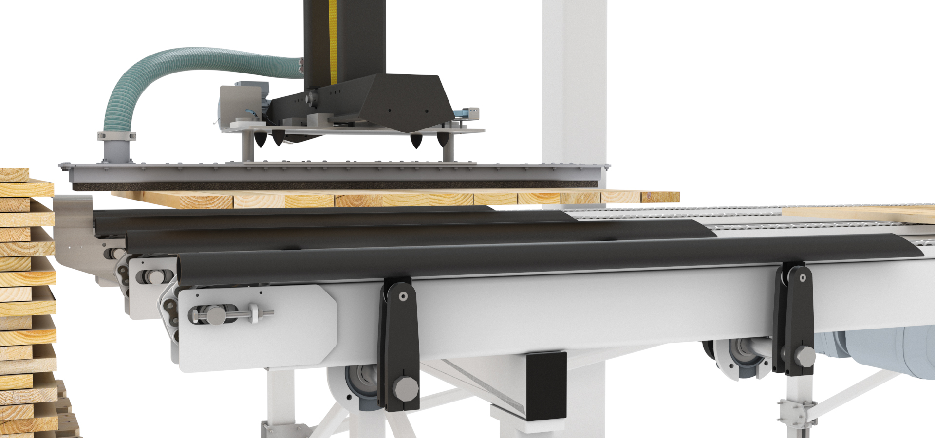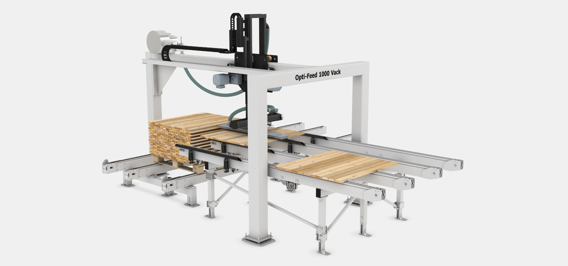 Opti-Feed 1000 Vack is a vacuum de-stacking unit for feeding of complete or partial workpiece layers into different main machines, such as cross-cut saws, moulding machines, double-end tenoners, resaws and sanding machines. This automated feeding system provides high machine capacity and frees up labor which is otherwise used on hard and repetitive work.