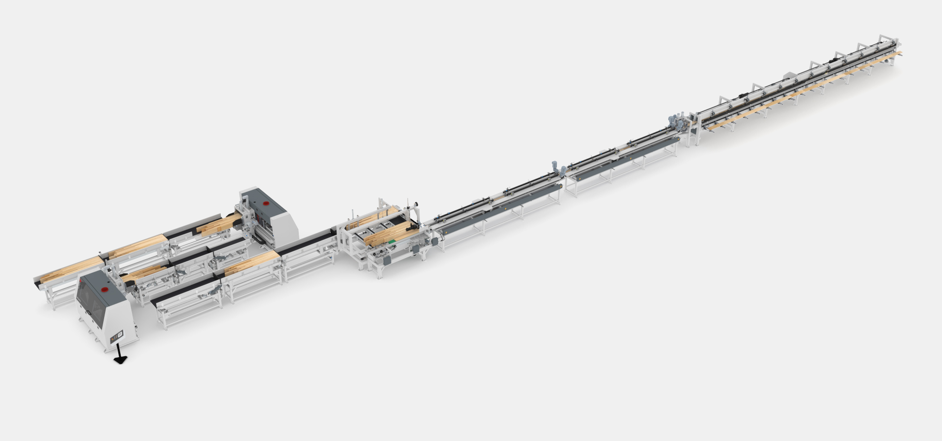 - Cross-cut to specific lengths by a flying cross-cut saw unit.